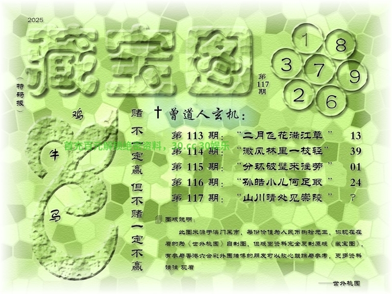 118期藏寶圖新:苏小门前万缕垂 老:伴人东去到江城 禁:羊 禁:5尾 玄機字:《存》