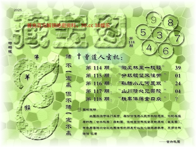 118期开奖时间2025年11月06(星期四)晚9:30开(农历九月十七 兔冲鸡)